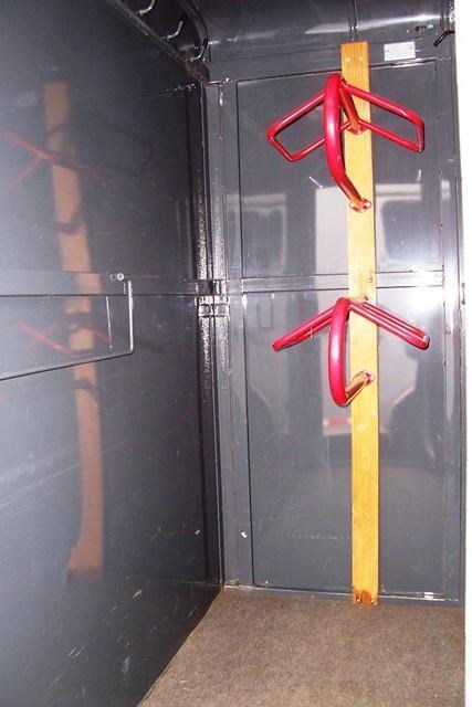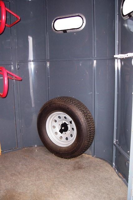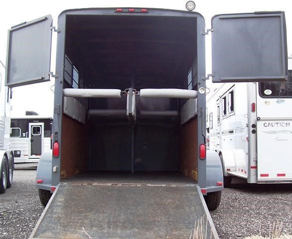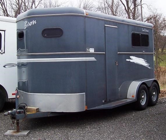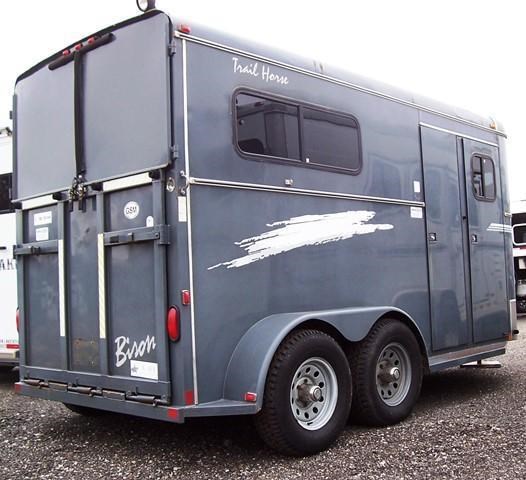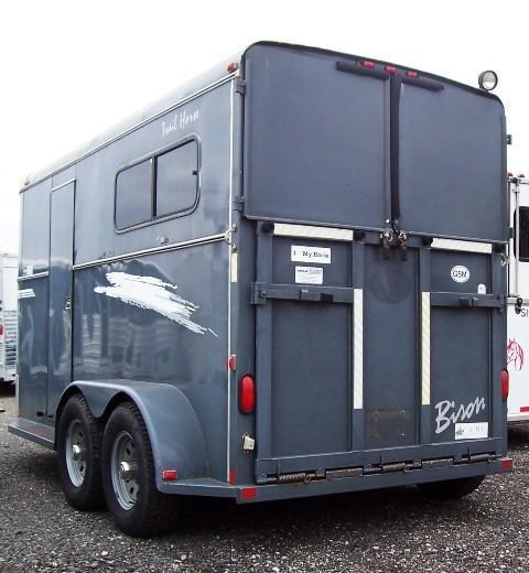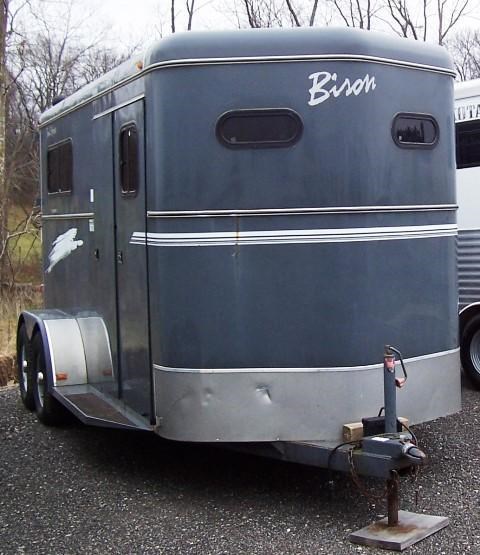 2002 Bison Bison Trail 2 Horse trailer with Dressing room, Aerodynamic "V" nose front end, Acrylic Urethane paint and primer, Smooth sided exterior wall over interior posts, Pin stripe and vinyl striping, Grease able hinges, 5" radius corner w/full sweep curved roof, Fiberglass front cap, Rubber torsion axles, 4 wheel electric brakes, Lockable steel doors, �" rubber floor mats, 2-way aluminum popup roof vents above each horse, Trailer body caulked prior to paint, Caulking around floor and side panels, Padded breast and butt bars, divider and outside wall, Pin less butt bar latching system, Interior lights in dressing room and horse area, All doors sealed, Horse ties inside and outside, Gravel guard on fenders and front wrap, Pressure treated 2" flooring running lengthwise, Undercoated wheel wells and frame, Spare tire bracket (inside front), P235-75R15" 6 lug silver mod wheels w/chrome center cap, 16"x48" slider window on each side, Cross members-1-1/2"x 3" on approx. 30" centers, Coupler 2-5/16" ball type, Lockable steel door w/16"x18" window in dressing room, Fixed front oval wins with clamp ring, Wood lining on side wall, Double rear door w/double plated cam latches and double lower wall, Formed rear corner post with header and oval rubber mount tail lights, D.O.T./CSA approved sealed lighting system w/high mounted license light and bracket, Head dividers hinged and removable, Breakaway battery w/maintenance charger