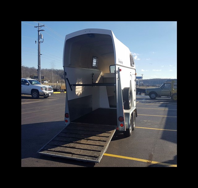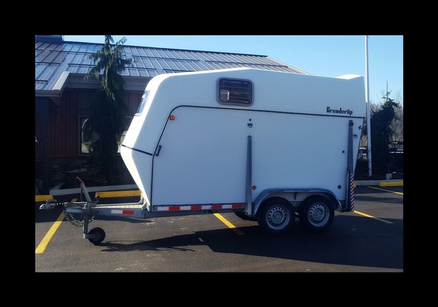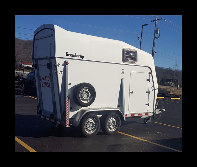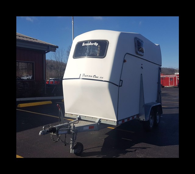 2004 Brenderup "Baron One" 1-Horse Trailer, GVWR: 3,400, Weight: 2,160, European Design For Smaller Vehicles And Doesn�t Require A Full Size Truck To Pull, Tack In Front, Saddle Racks, Bridle Hook, Blanket Bar And A Convenient Seat, 2? Ball Hitch, Inertia Brakes(Doesn�t Require Electric Brakes On Tow Vehicle), Flat 4 Plug, Large Tinted Front Window, Padded Butt Bar, Easy-lift 5' Tall Rear Ramp, Ramp Mat w/Toeholds, Rear Storm Panel � Run With Panel Up Or Down For Additional Light And Ventilation, Radial Tires (Includes Spare), Groom Door For Access To Horse, Galvanized Steel Frame, LED Lights. Model: Baron One GVWR: 3,400 Weight: 2,160 Color: White Rear Ramp Groom Door Front Tack Radial Tires w/Spare LED Lights
