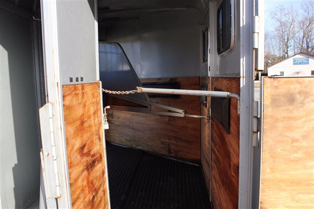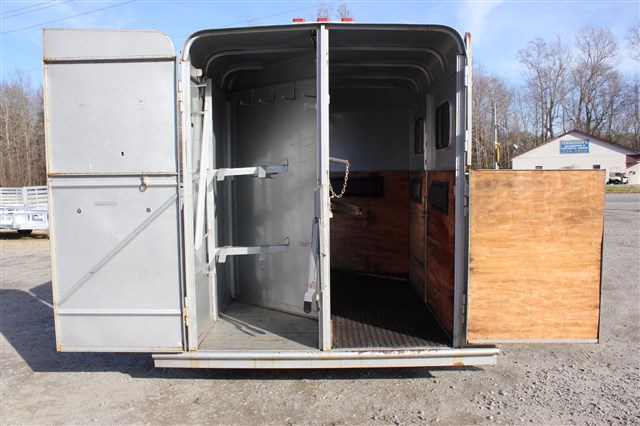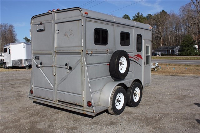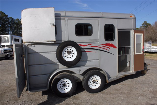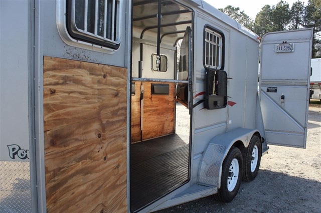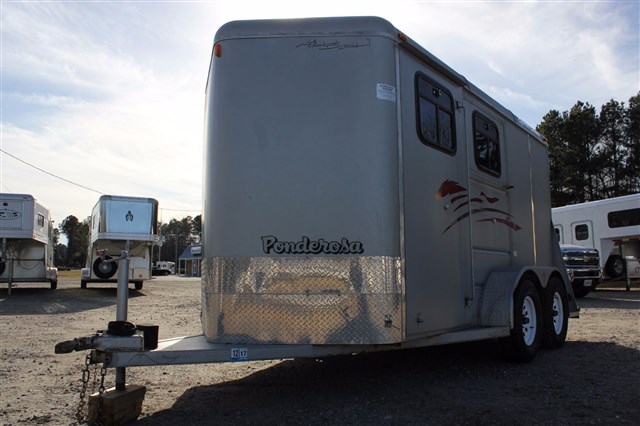 2009 Ponderosa 2 Horse Slant Bumper Pull , 7' tall; 6' wide; 40" wide stalls; 14' long - good condition wooden floor with rubber mats in horse area - front dressing room with window and camper door with screen - 4 brand new tires - spare tire - bearings packed and new seals 12/27/16 - 50/50 rear door - rear tack w/ saddle racks and bridle hooks - escape door first horse - drop down windows at each head - sliding windows curb side - pop up roof vent for each horse