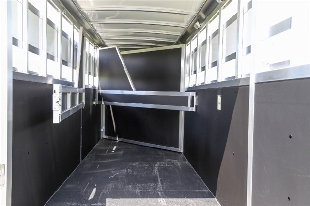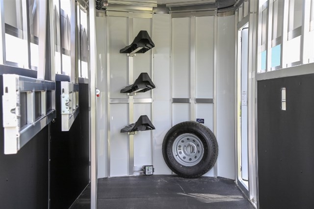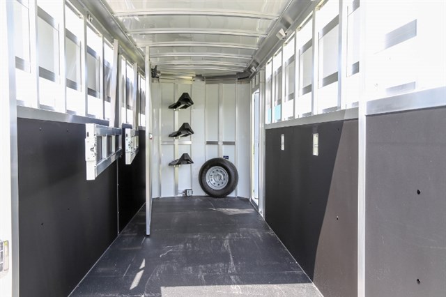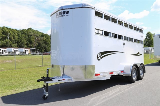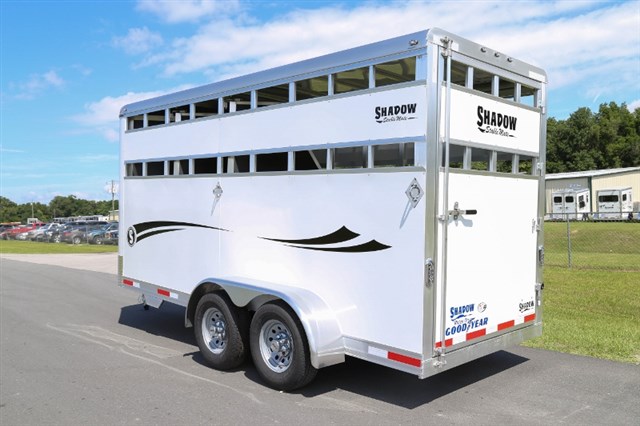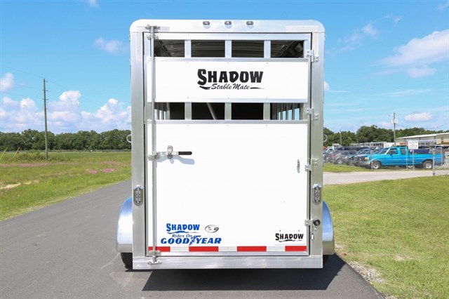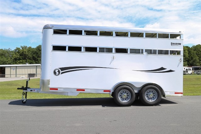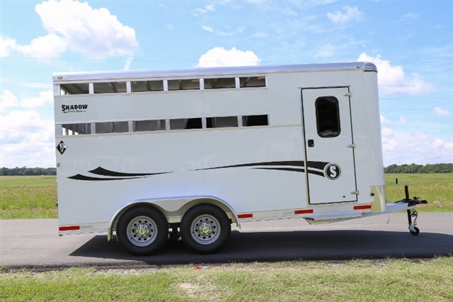 2015 Shadow 3 horse trailer BP, slant load bumper pull, 6'4" Wide x 7'6"Tall x 17' Long Includes:, Dressing room w/ 24" shortwall, Camper door w/ 14x24 window, Saddle rack mounts, Bridle hooks, Graphics, Spare tire, Stock sides head, hip, and rear door, Wood Floor, Aluminum stall divider w/ Shadow board lining, Dressing room swing wall and Dome lights.