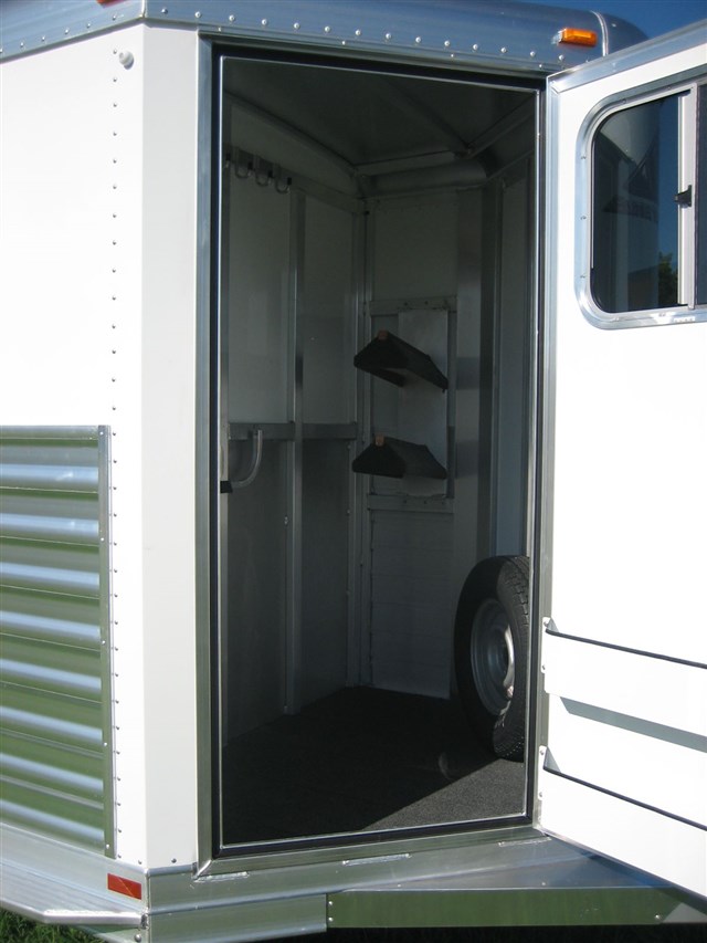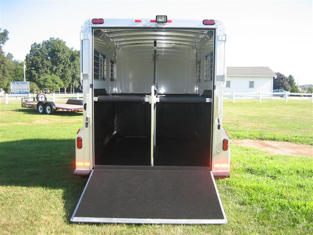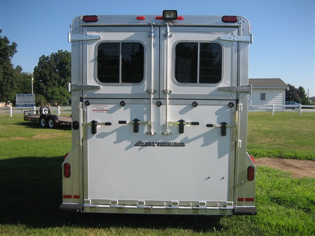 2017 Elite 2 Horse trailer Straight Load BP, This trailer has aluminum on the bottom half of the trailer and white aluminum above the slats. Drop down window in rear doors, drop windows in escape doors, a loading ramp, 2 lights (1 in each horse area) and 1 in DR, LED exterior lights, a Halogen load light, inside and outside ties, vents in horse area, spare tire, a blanket bar, breast/butt bars, 2 place saddle rack, 10 bridle hooks, 2 brush trays, rubber mats, rubber walls & bumper, carpet in DR.
