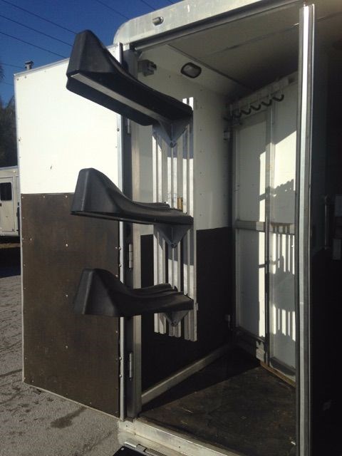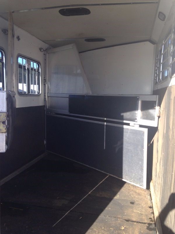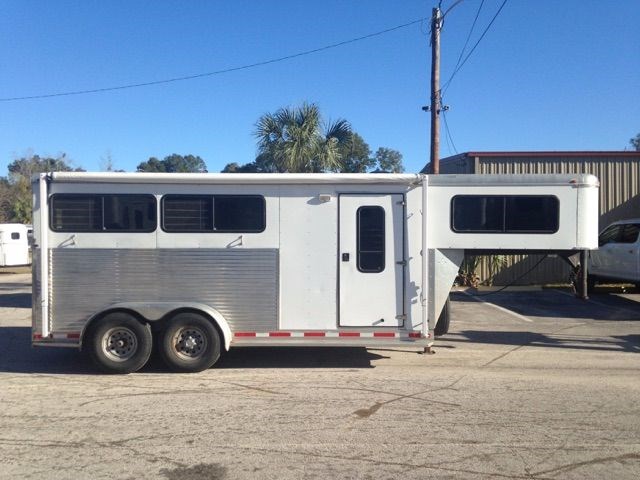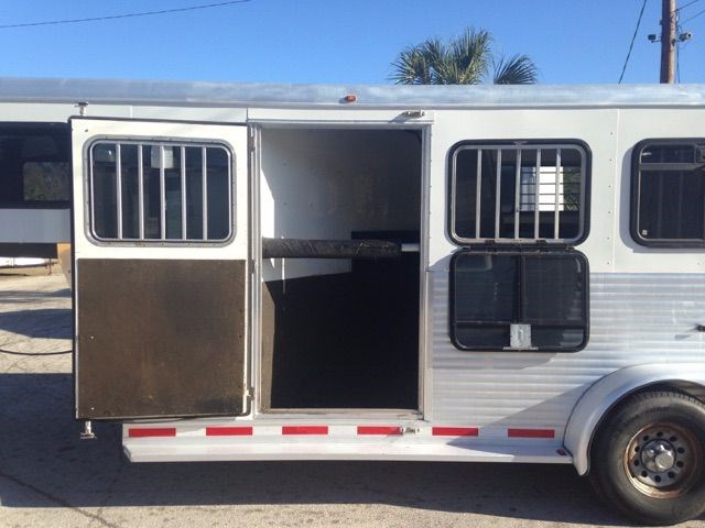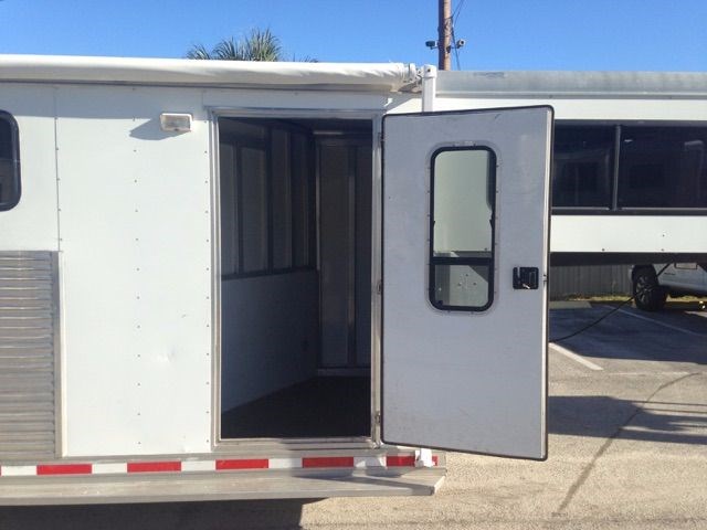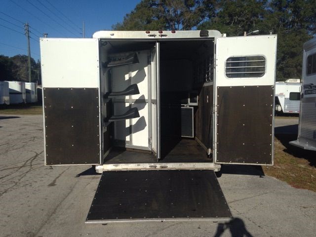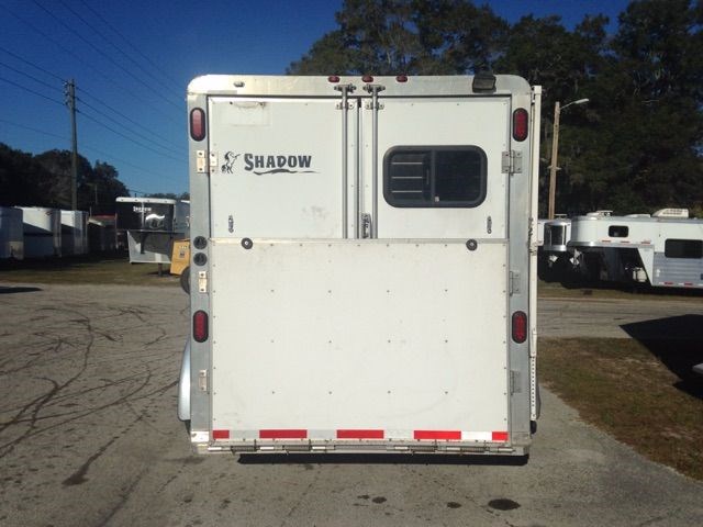 2003 Shadow (3) horse slant load gooseneck trailer with a tack room that has an area for saddle racks, bridle hooks and a brush box. The horse compartment has an interior height of 7' tall x 7' wide, escape door, drop down windows at the horses heads with drop down aluminum bars, slatted stock sides at the horse horses hips, insulated roof, rubber mats over aluminum floor, rear collasiple tack room with a (3) tier swing out saddle rack along with extra bridle hooks and double back rear doors with a rear ramp! The exterior has a manual jack, two 7000lbs axles with a spare tire and an awning. Clean!
