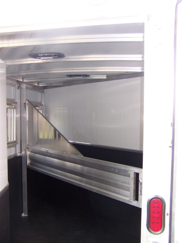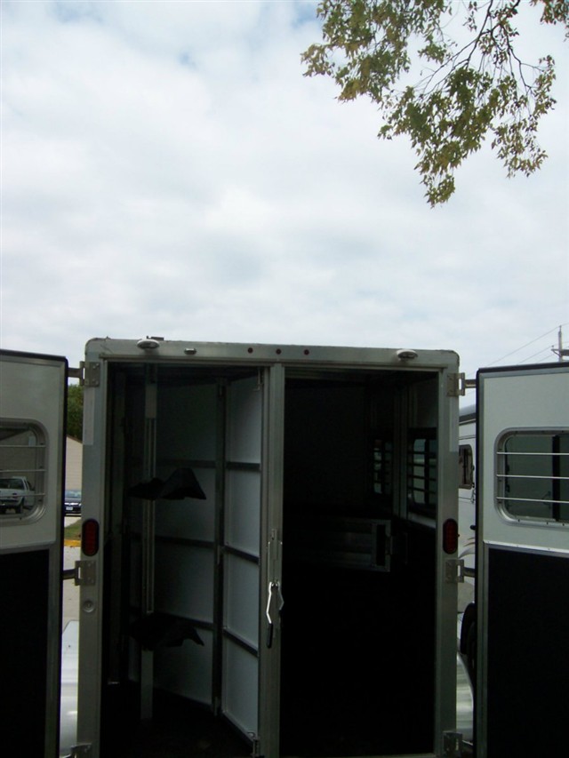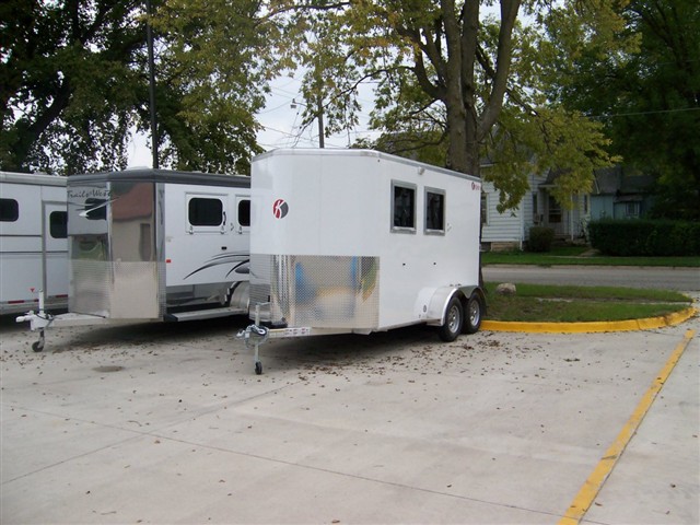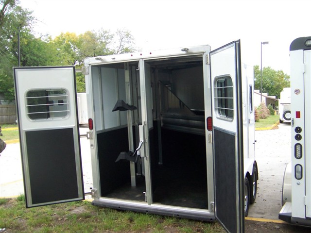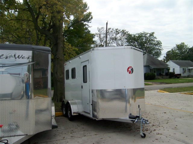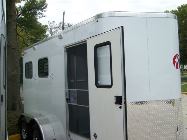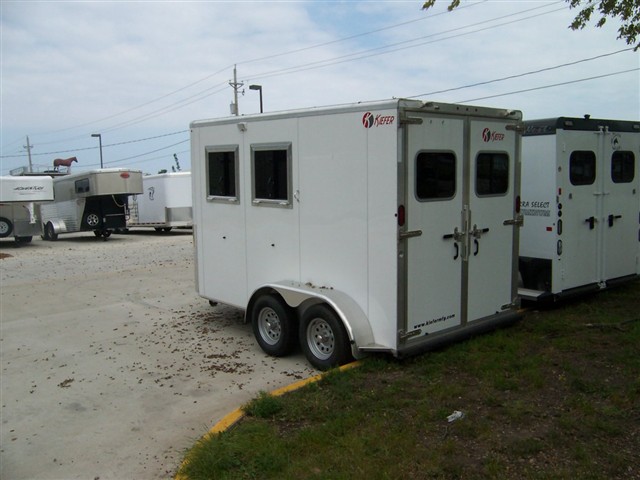 2014 Kiefer Kruiser 2 Horse trailer, bumper pull trailer, Empty Weight 2,240 lbs., GVWR 7,000 lbs., Floor Length 14' 3", Width 6' 8", Height 7' 4", Short wall in tack room 6", Stall Width 40", Tires 205x15, Axles 2 @ 3,500 lbs., 50/50 rear door, Camper door with screen in tack room, Framed for A/C in tack room, Rear Tack, Outside light package = 2 Load lights, 3 porch lights with toggle switch, Spare Tire, Gravel Guard, 100X windows, Extra outside tie loop, 2 5/15" Coupler, Color White.