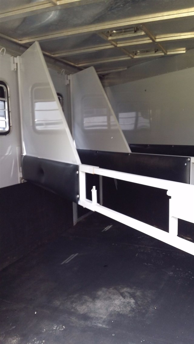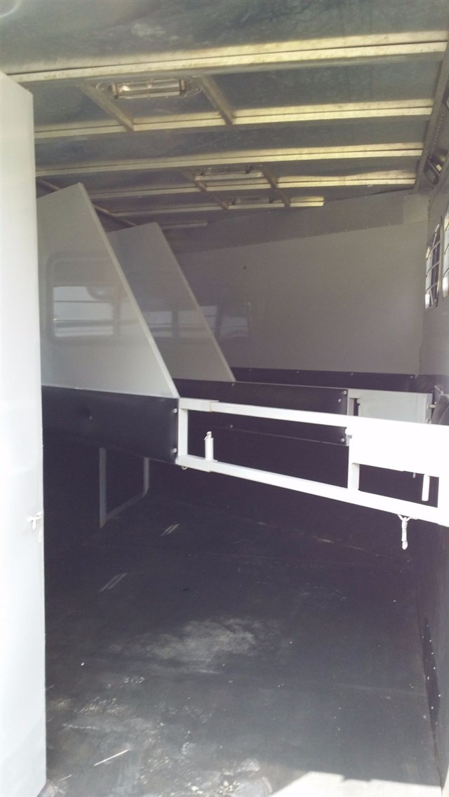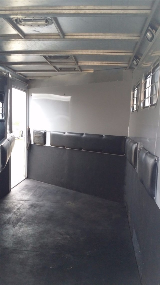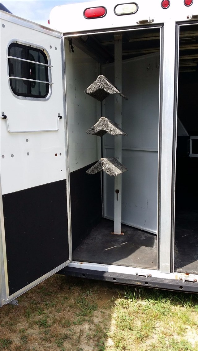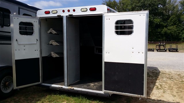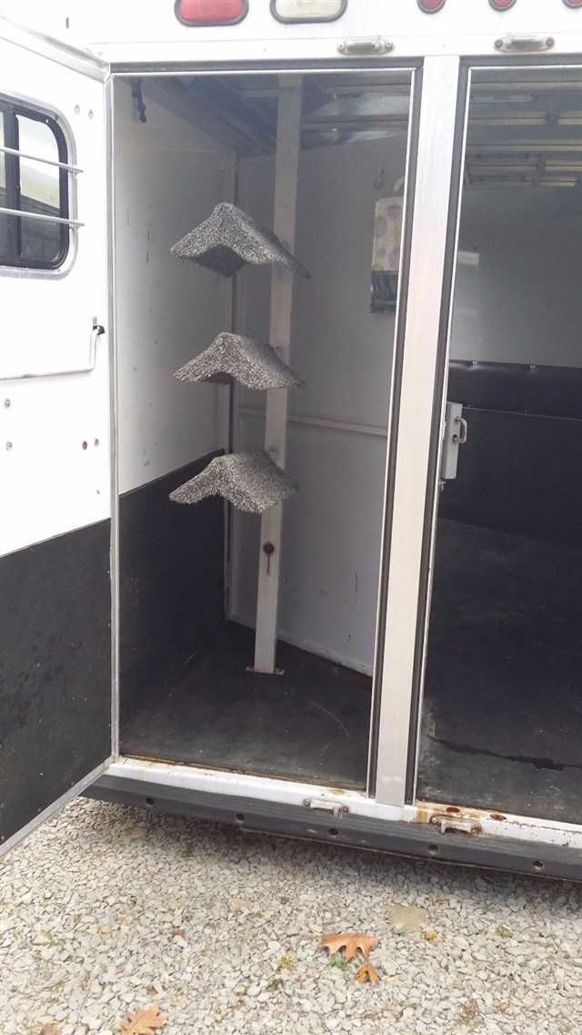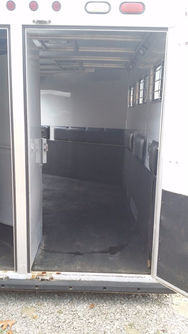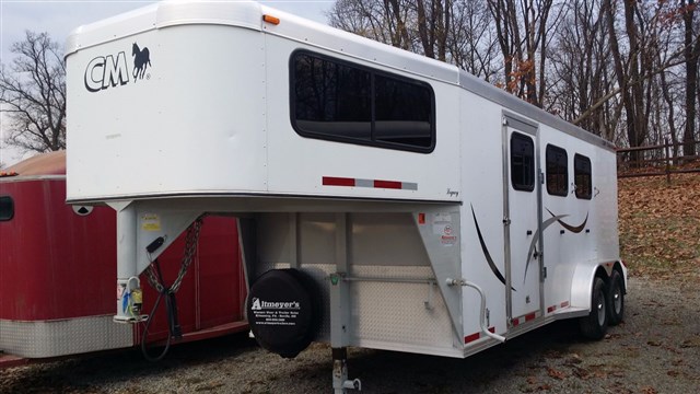 2003 CM 3 horse gooseneck. This trailer is white and has a walk out door at the first horse, drop down feed doors at all 3 horses heads, sliding windows at each horses hip, the roof in the dressing room is lined and insulated, folding rear tack with 3 saddle racks on a removeable post.