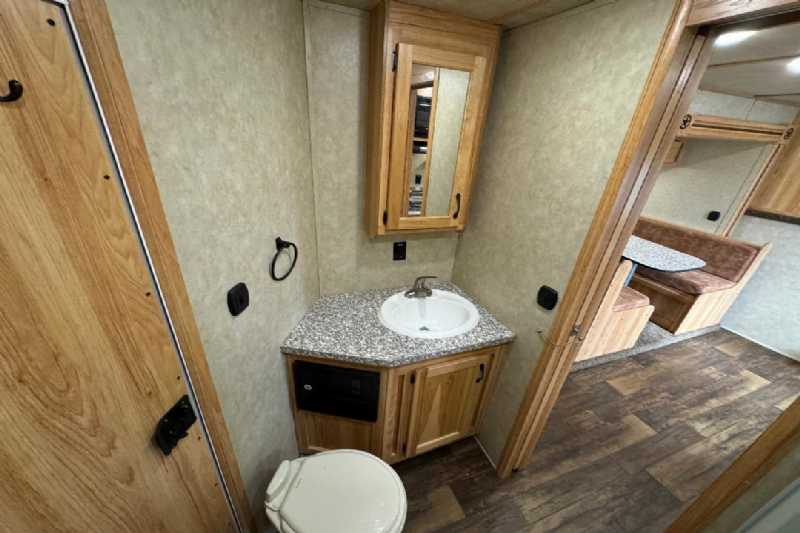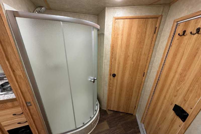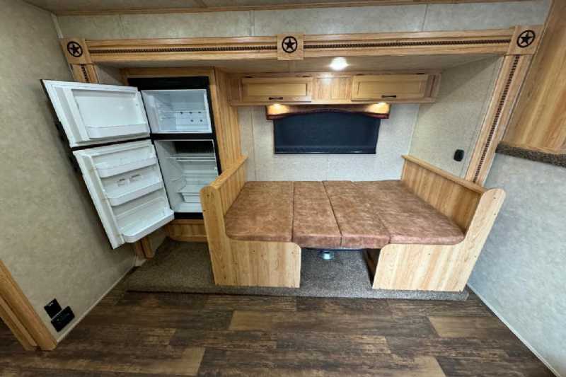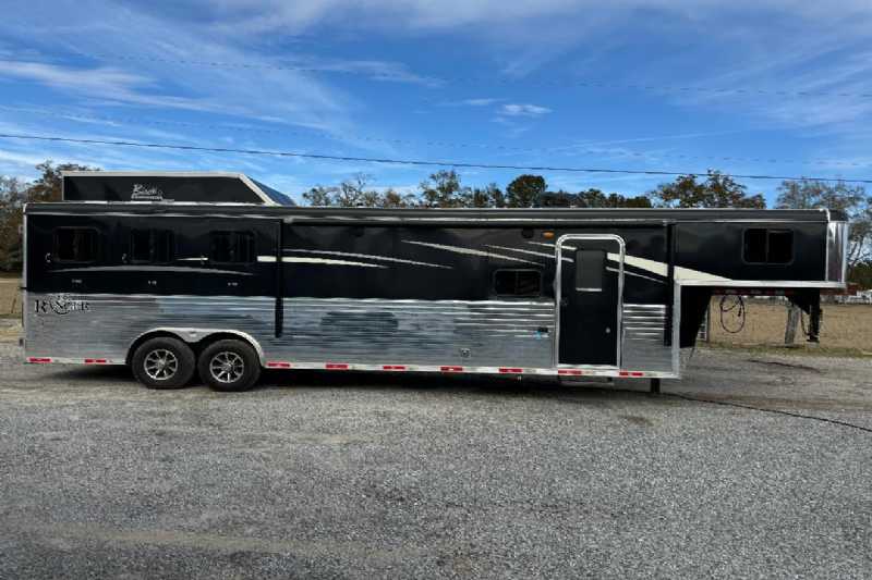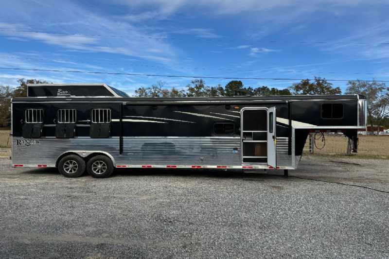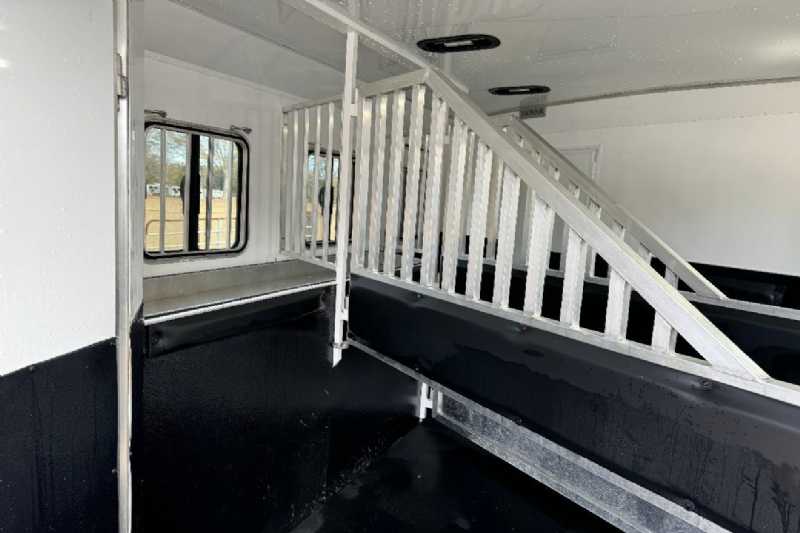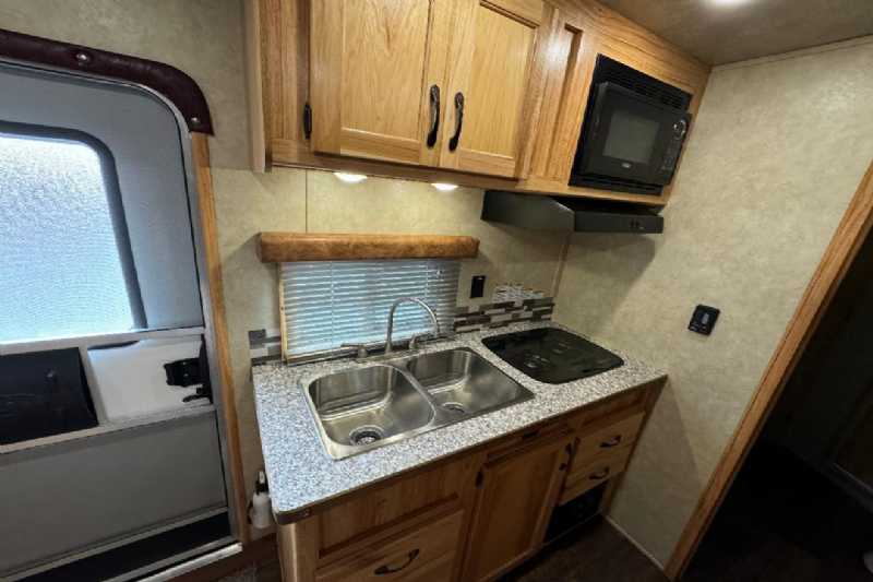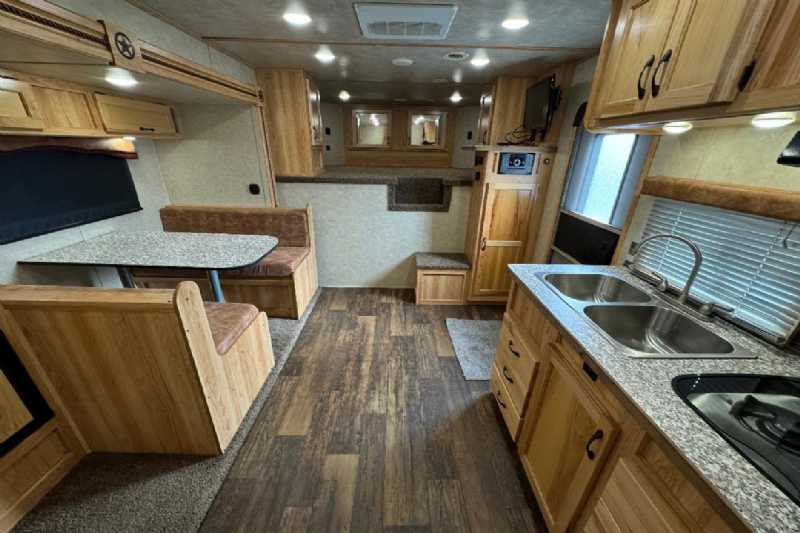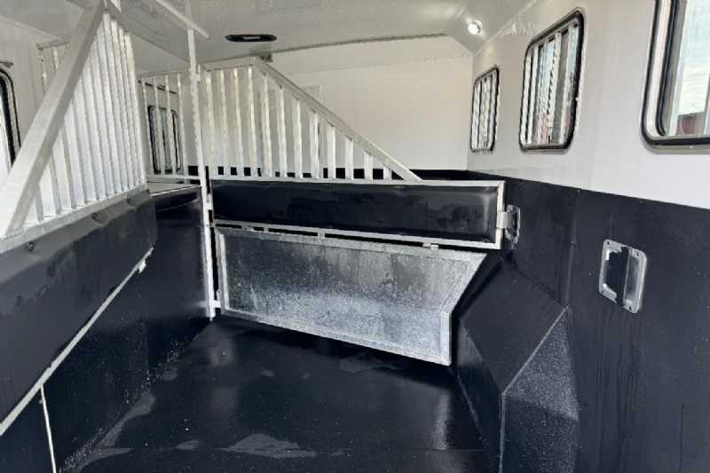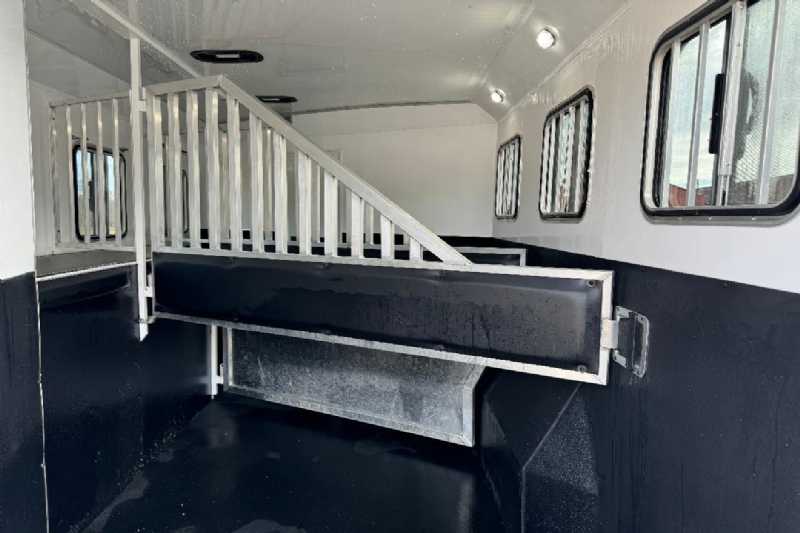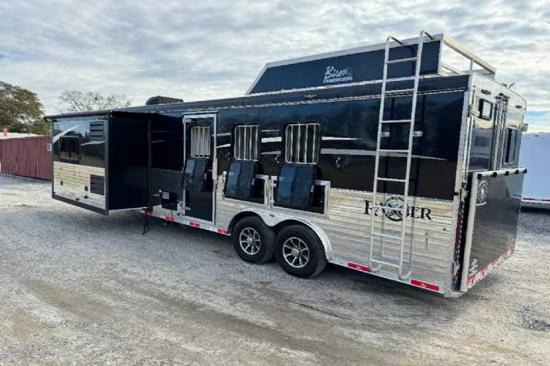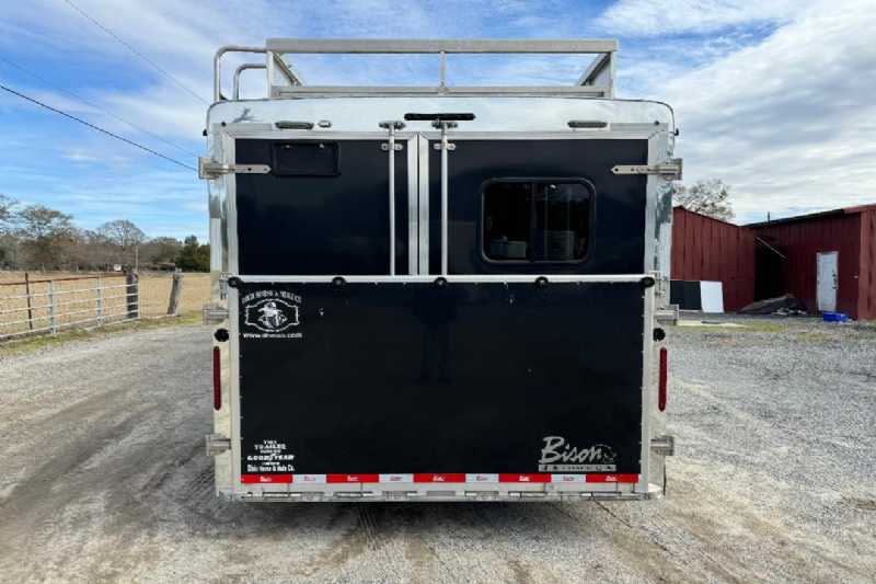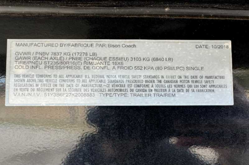 2019 Bison 8311SO Features Living Quarters Glideout 11' Shortwall 16' Longwall Walk-thru Door Kitchen Refrigerator Cooktop Microwave Living Area Dinette A/C Furnace Radio Antenna Bathroom Bathroom Sink Toilet Shower Plumbing Fresh Water Gray Water Holding Black Water Holding Water Heater Power LP Tank(s) Battery Wired for 110v power Horse Area 3 Horse Escape Door Mangers Hayrack Trailer Steel Construction Hydraulic Jack Spare Tire Pressure Treated Wood Floor 7000# Axles 16-inch Tires Electric Awning Dimensions & Weights Dimensions & Weights are approximate Outside Width: 8' Inside Height: 7'4 (22 hands) Box Length: 25' Empty Weight: 10195 lbs. GVWR: 17278 lbs.