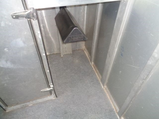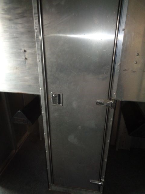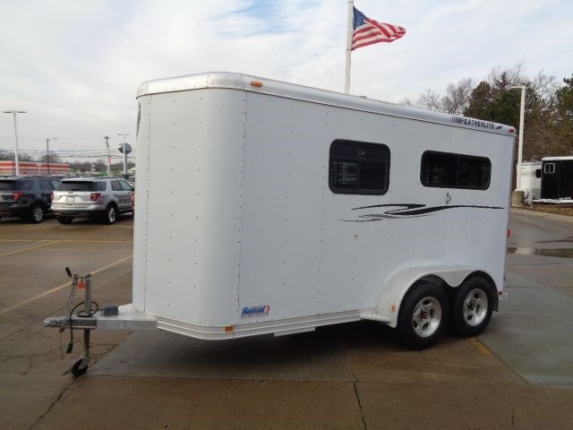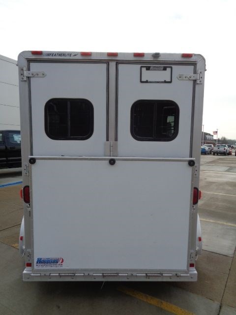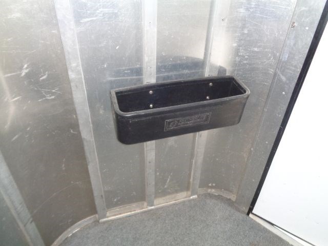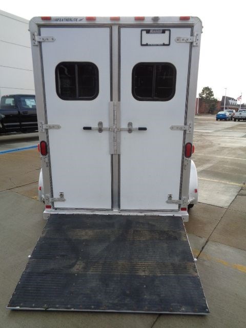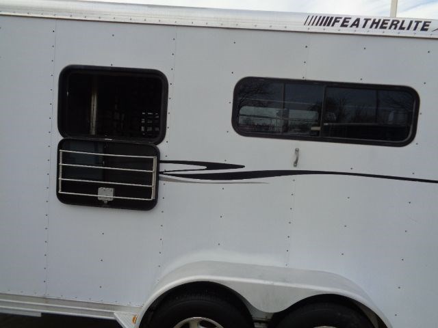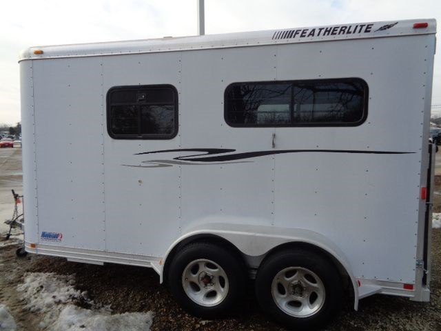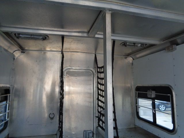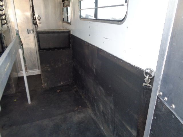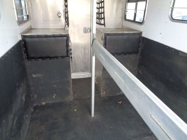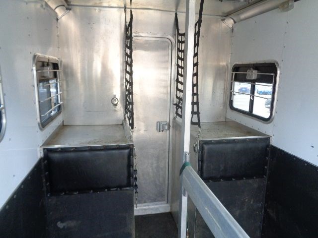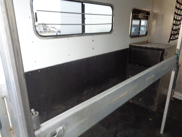 2000 Featherlite model #9407, 2 horse straight load bumper pull trailer, all aluminum, 6' wide & is 7'6" tall with a 14' floor length. Trailer also comes with a rear loading ramp behind double doors, mangers with center walk-thru door into large dressing room, rubber floor mats over aluminum floor in horse area, (4) good matching BF Goodrich tires on aluminum wheels as well as brush box, halter hooks, adjustable saddle racks & a clothes rod in the front tack area.