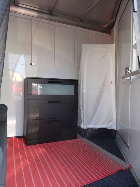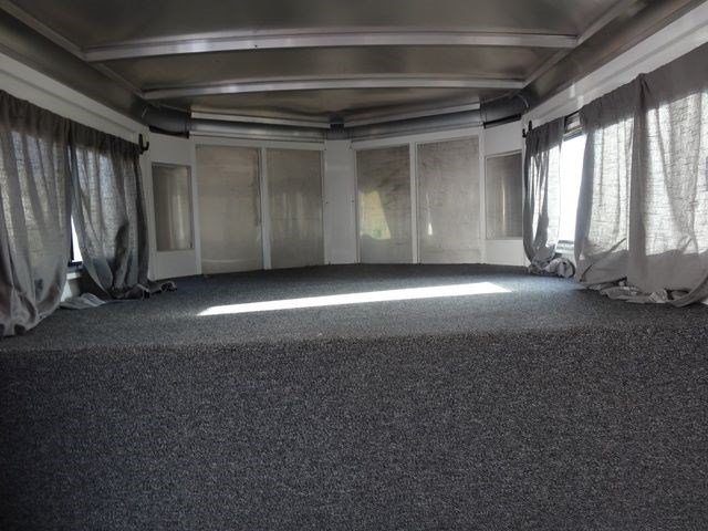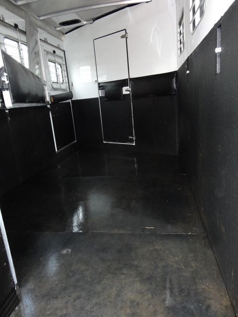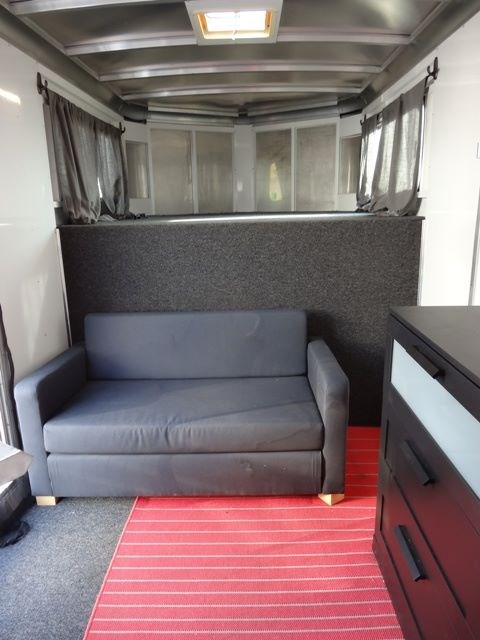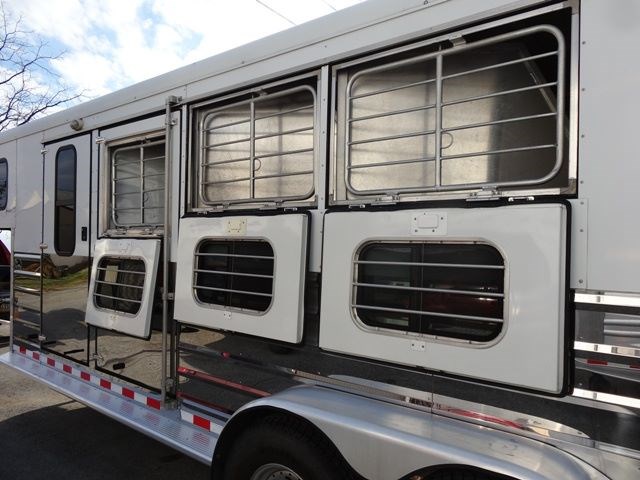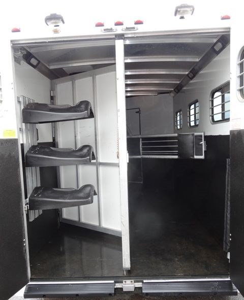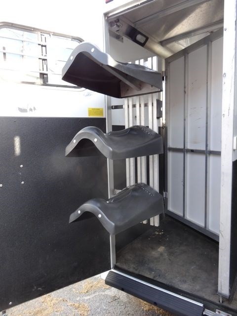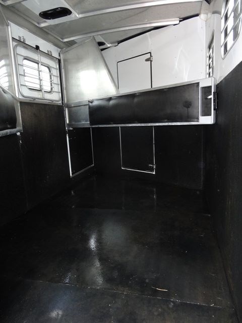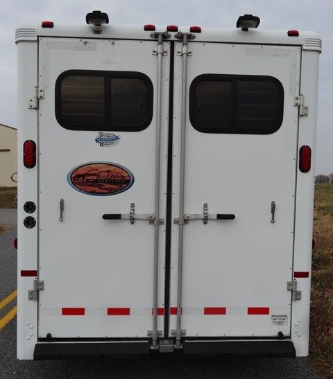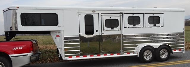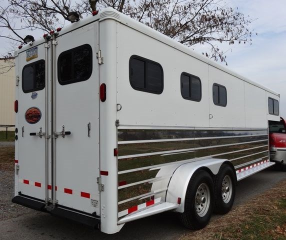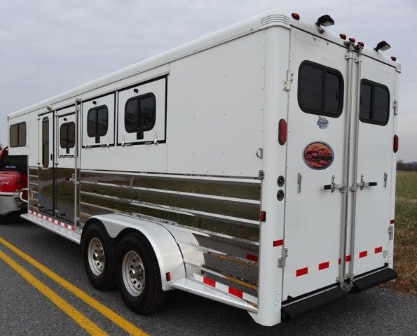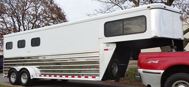 2005 Sundowner 3 Horse trailer, slant load trailer with large dressing room. This is an aluminum trailer with an aluminum floor and a steel frame. It is 7 foot tall, 6 foot 6 inches wide inside and 20 foot 6 inches long on the floor. The carpeted dressing room is 5 foot on the short wall and 9 foot on the long wall, and has a portable clothes rack, dresser and small sofa, brush box, interior light and a walk through door to the horse area. The horse area has rubber mats, interior lights, 3 roof vents, rubber lined walls, first horse escape door, two loading lights, 3 drop down windows with grill guards on the head side and bus windows on the curb side. The collapsible rear tack has 3 swing-out saddle racks, 4 bridle hooks and an interior light. The saddle racks can also be mounted in the dressing room. The 10 ply tires were new this year.