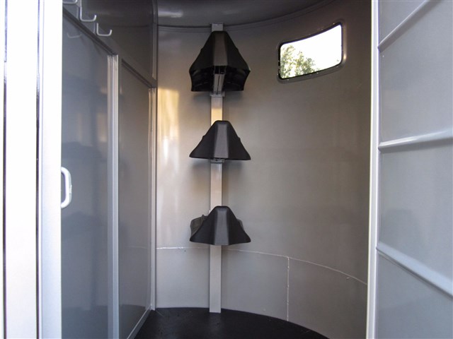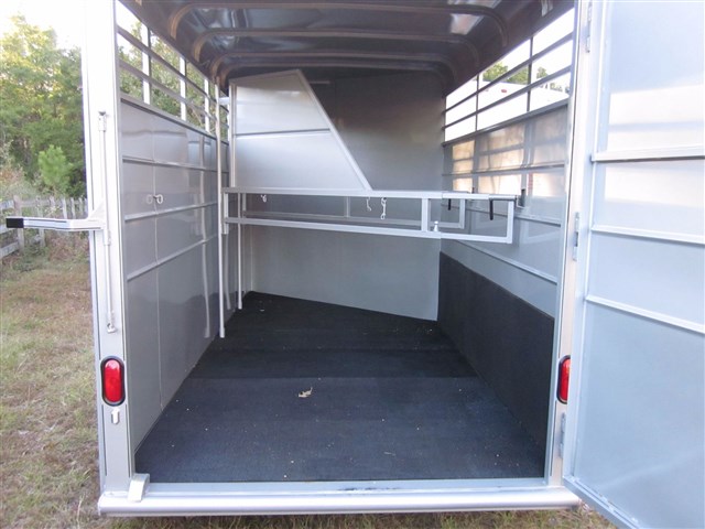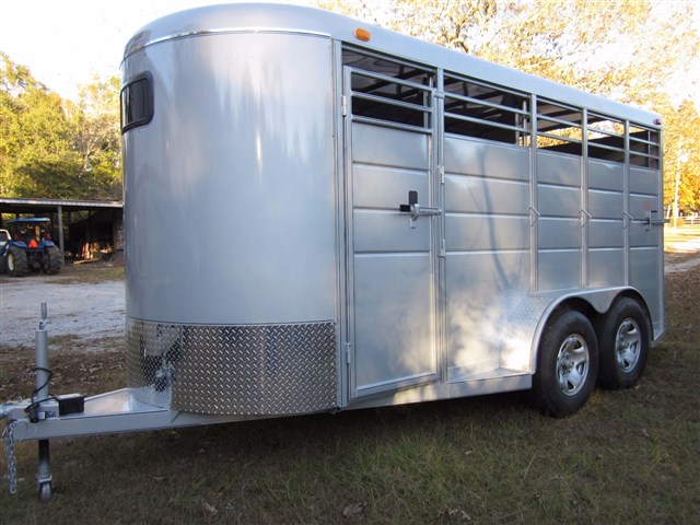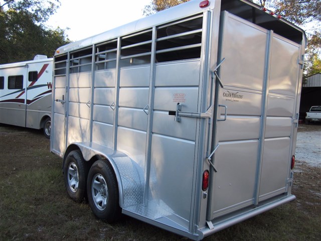2017 Calico 3 horse slant bumper pull with stationary dressing room wall. 7' tall 16' long x 6' wide x 7' tall 6" radius low profile roof 2 " 3500 lb. torflex axles (7000 lb. g.v.w.) weight of trailer: approximately 3060 lbs. 4 wheel electric brakes 3 deluxe saddle racks in dressing room tack hooks window in heavy duty steel dressing room door 2 interior lights - 1 in dressing room & 1 in horse area 2 removable dividers in horse area escape door in front of 1st horse 16" 10 ply radial tires with 6 lug wheels roof bows and floor braces every 2 feet 2 x 8 pressure treated floor automotive grade paint this is a really nice well built steel trailer that is user friendly (both for the horse and the owner).