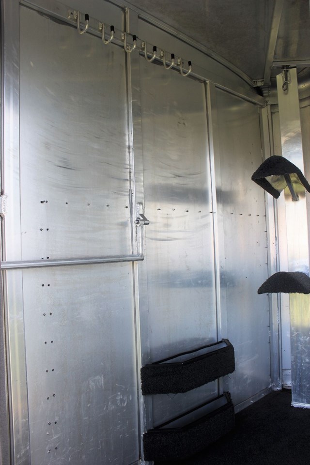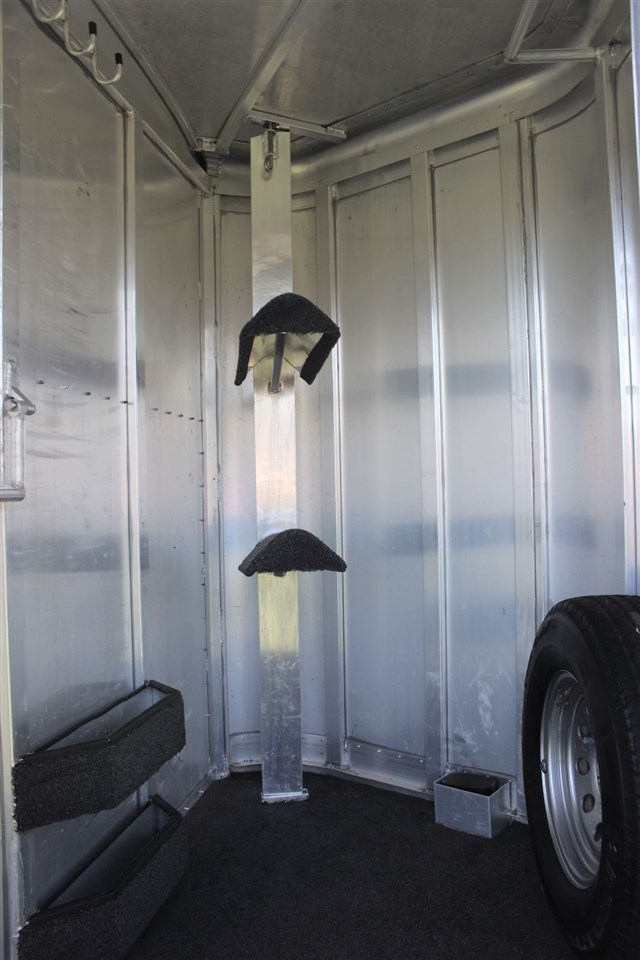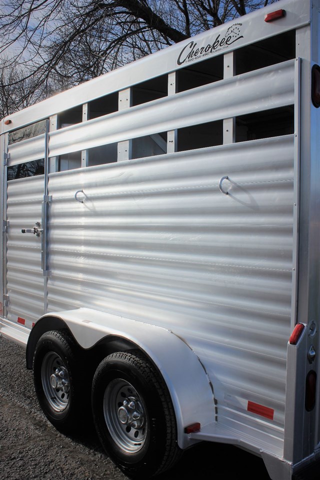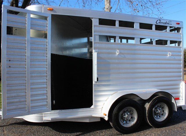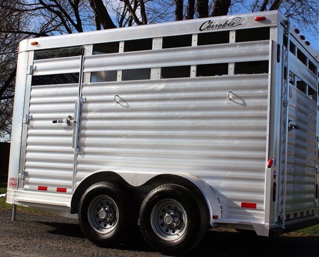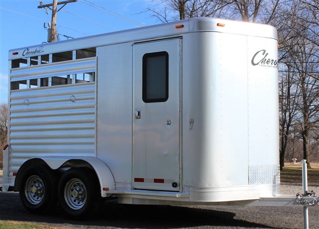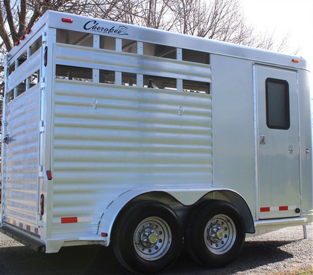 2004 Cherokee 2 horse trailer slant load, bumper pull, 7w x 13l x 7t, rubber torsion axles, 4 wheel electric brakes, spare tire & wheel. front dressing area features: rv-style entry door with screed, 2-place saddle rack, (2) brush trays, blanket bar, (6) tack hooks. horse area features: rubber lined rear gate-hip wall- & slant wall, rubber floor mats, padded divider, dome light.