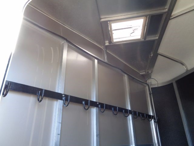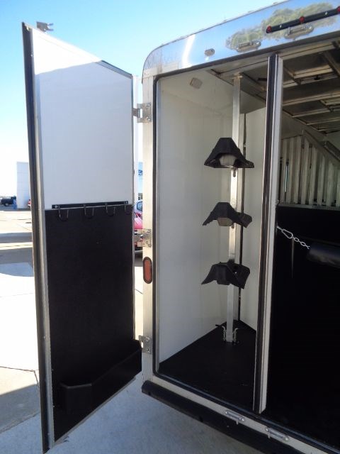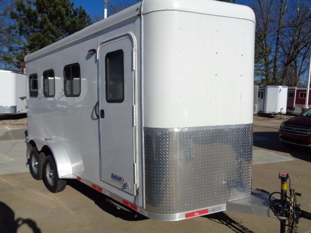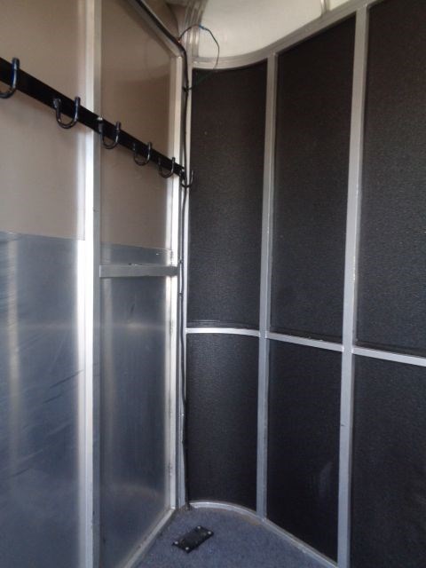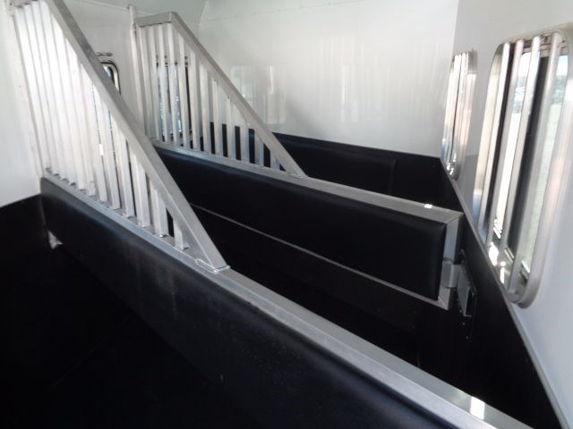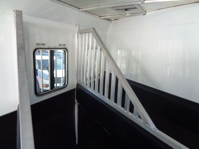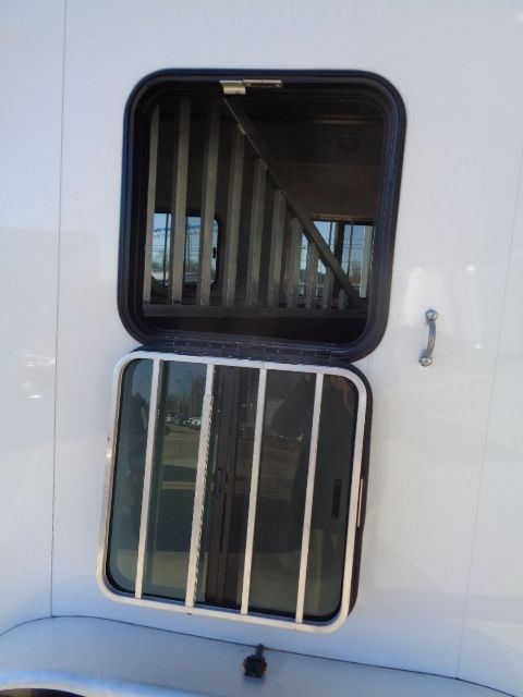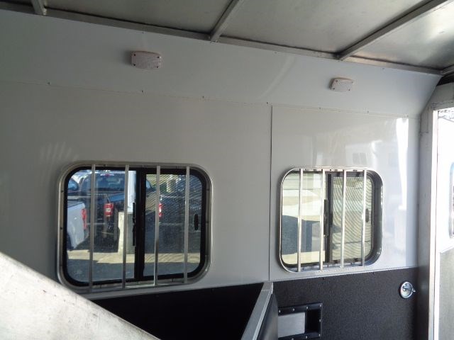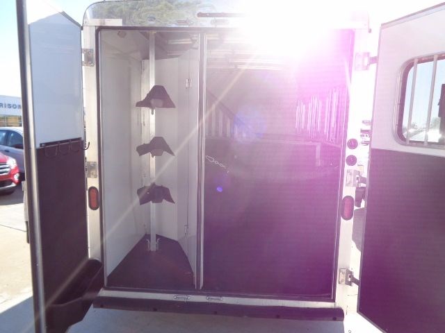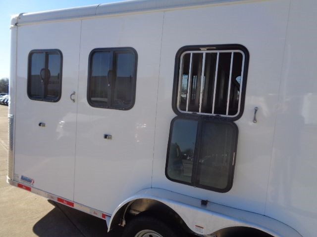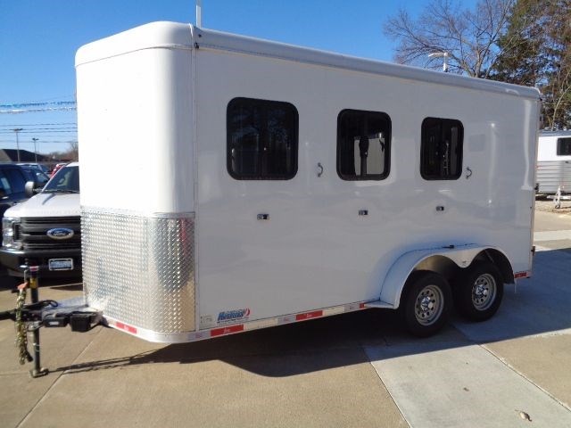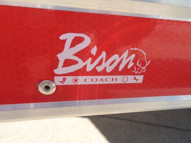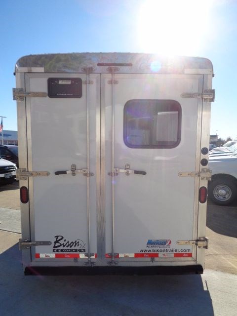 2015 Bison 3 horse bumper pull trailer with many great features & options. All aluminum This trailer measures 7' wide x 7'6" tall with a 14' overall floor length. It includes premium Goodyear tires on 3,500# tandem axles, drop down head windows & bars, slider butt windows with screens, collapsible rear tack wall, thick rubber mats over aluminum floors, padded dividers & a nice size dressing room with roof vent, halter hooks & floor & ceiling brackets for mounting saddle rack post in front or rear tack area.