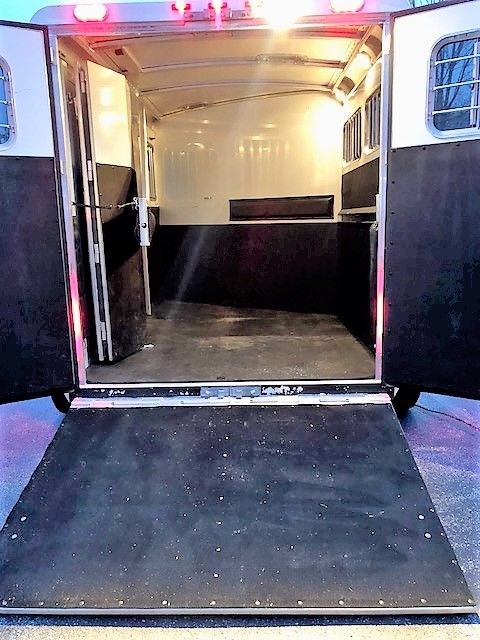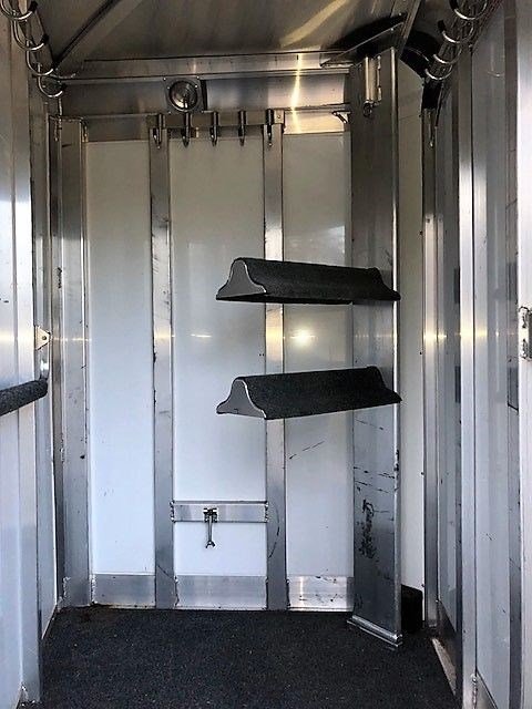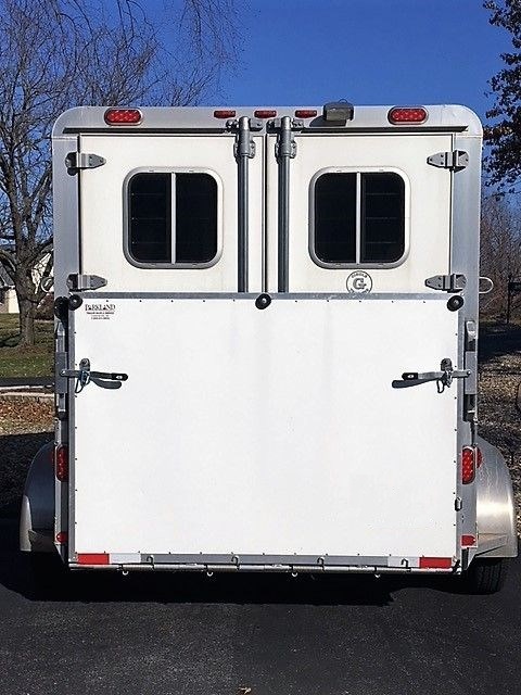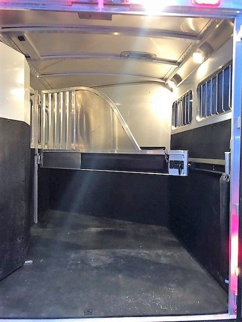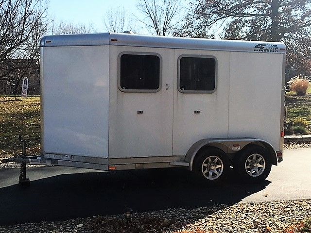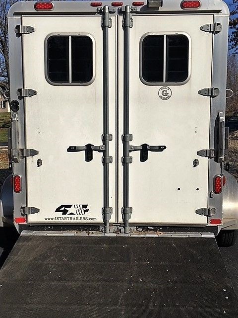 2014 4-Star Runabout, 2 Horse trailer. Slant Load Horse Trailer Front and Collapsible Rear tack room, extra hooks. Ramp. 5 - 6ply radial tires, 15" Aluminum wheels, Insulated & Double walled full length horse compartment, rubber lined walls in horse compartment, smooth ribbed aluminum floors, with floor mats full length horse compartment, perm bulk head wall, dressing room approx 26 1/2 sq ft, dressing room door w/ window, carpeting, Half divider w/head and wither shield w/pads and hold back, drop down windows w/bars, hip windows, double rear doors 40/60 w/window, 2 saddle racks, 1 blanket bar, 10+ Bridle hooks, 2 brush trays, 2 inside & outside trailer ties, LED lighting, high turn signals, 4 dome lights, halogen load light, two way roof vents. 11'0" L x 7'0" H x 6'10"W 3500# Torsion Axles, Electric Brakes 2 5/16 Coupler 5 bolt hubs